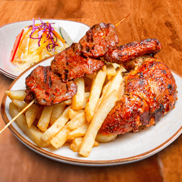 1/4 pollo + anticucho + papas fritas + ensalada