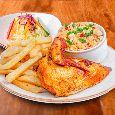 1/4 pollo + chaufa + papas fritas + ensalada